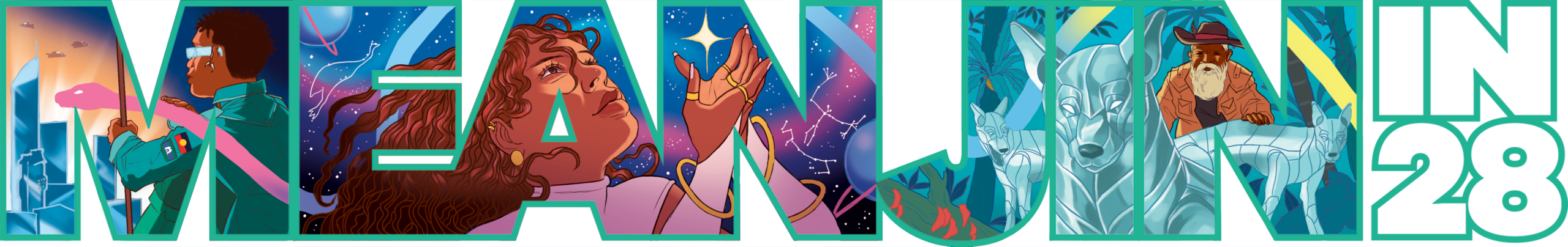 The ‘Meanjin in 28’ logo developed by First Nations visual artist Tori-Jay Mordey is a skillful representation of what it is to have Worldcon come to Meanjin. It highlights the relationship between self and country held by First Nations Australians, and explores time, space, and land across speculative-fiction genres.